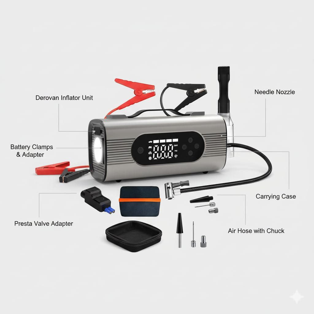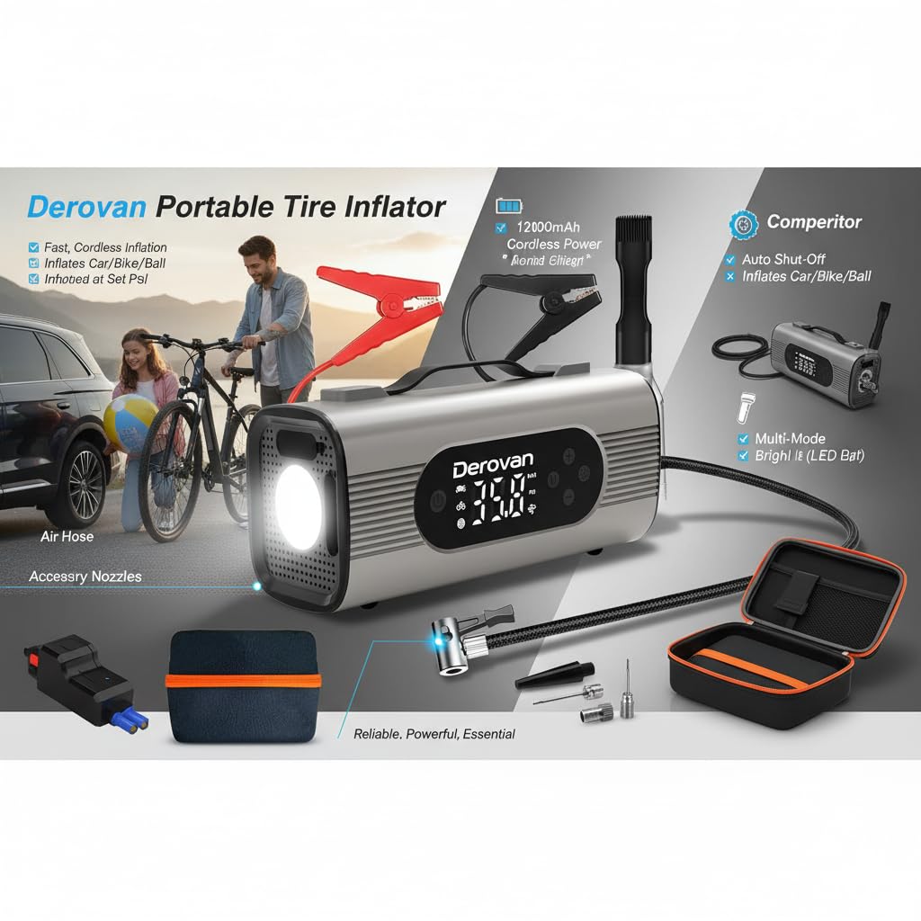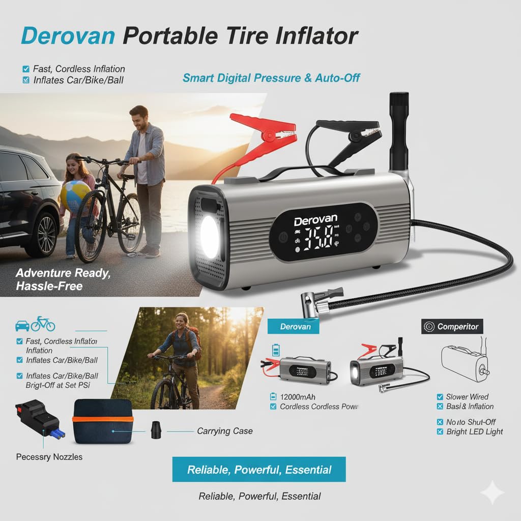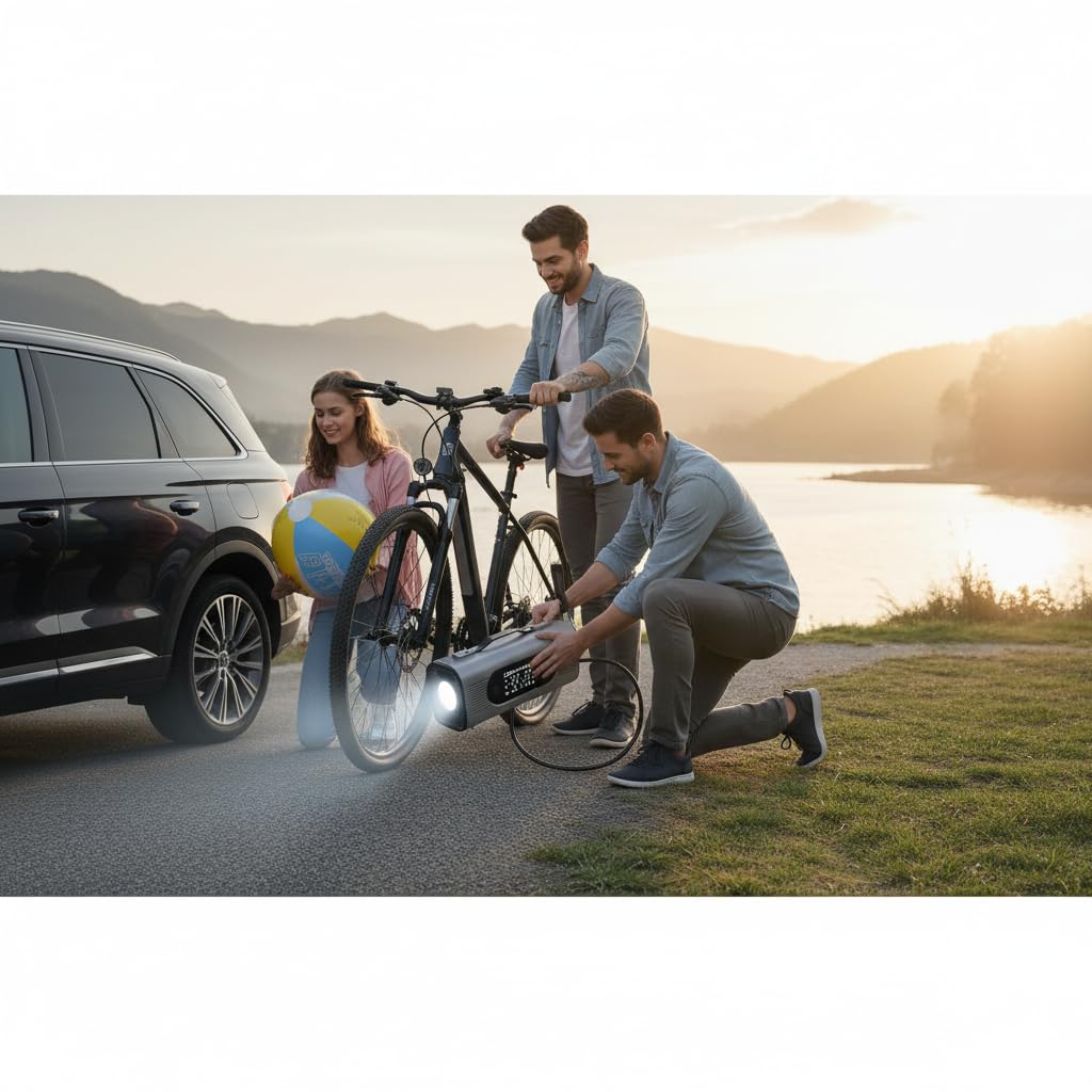 Wide Vehicle Compatibility – Ideal for passenger cars, SUVs, SUVs, motorcycles, bicycles, RV trailers, air beds, and inflatables thanks to multiple adapter nozzles and a long 3–3.5 m hose.