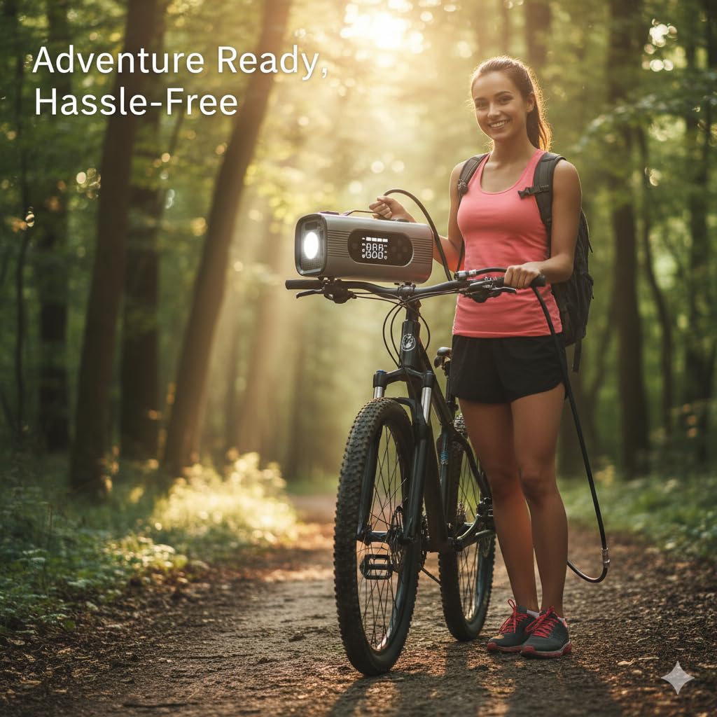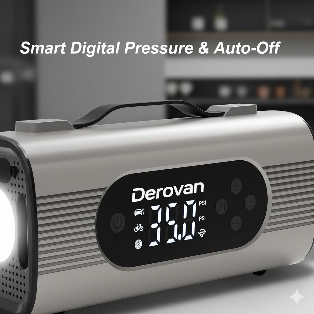 Smart Auto Shut-Off & Gauge – Digital pressure gauge displays real-time PSI/Bar/kPa values and automatically stops at preset pressure—preventing over-inflation.