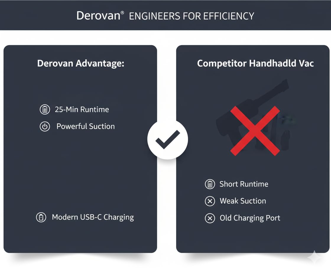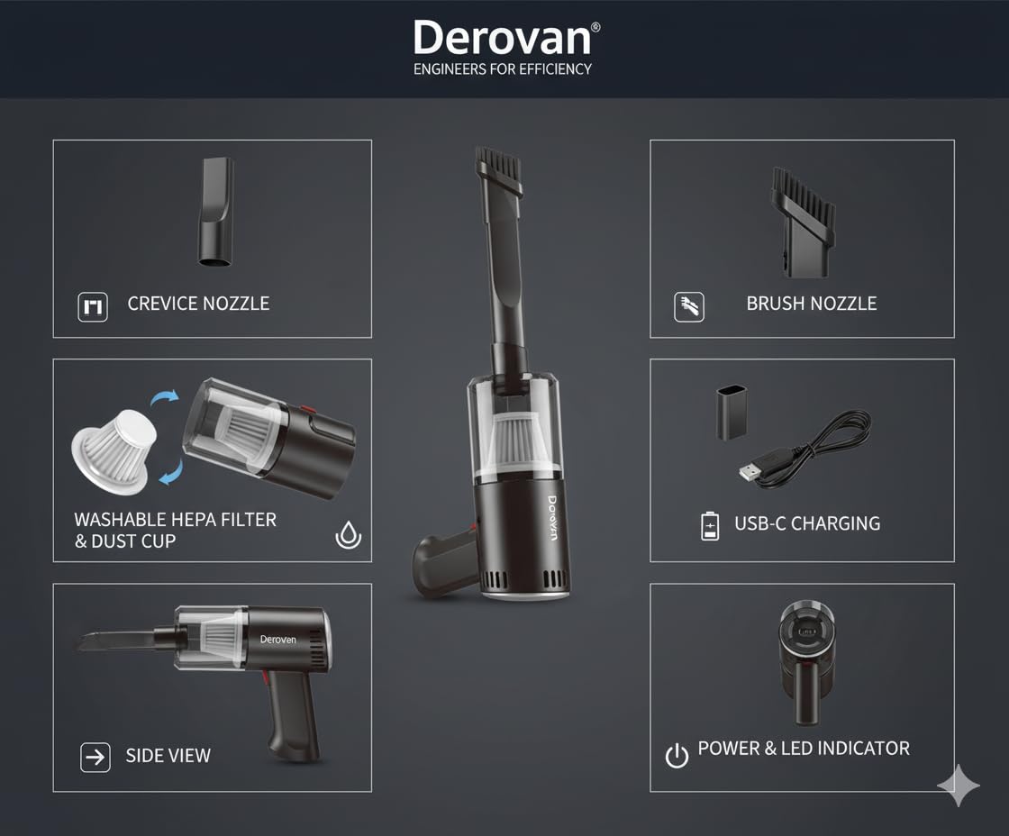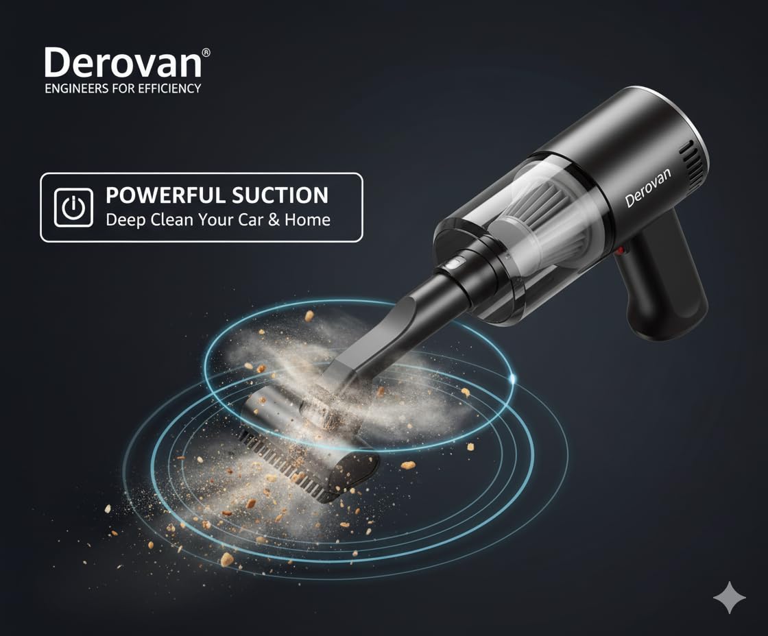 Powerful suction – 120 W motor delivering 9000 Pa suction cleans pet hair, crumbs, dust and sand efficiently in car seats, dashboard, carpets and crevices.