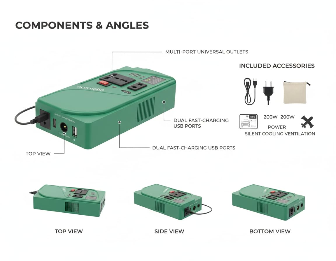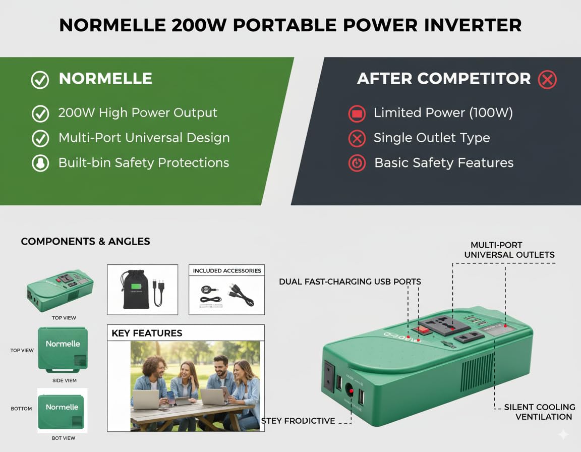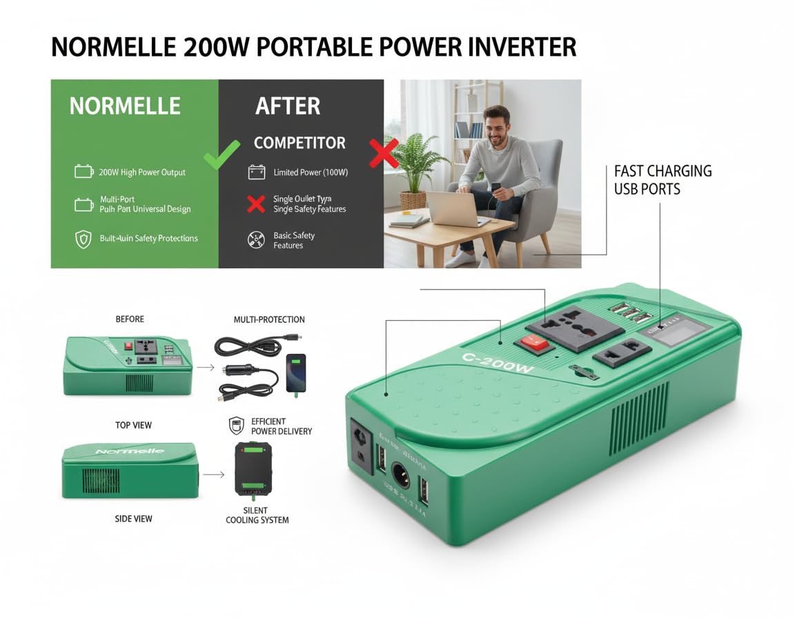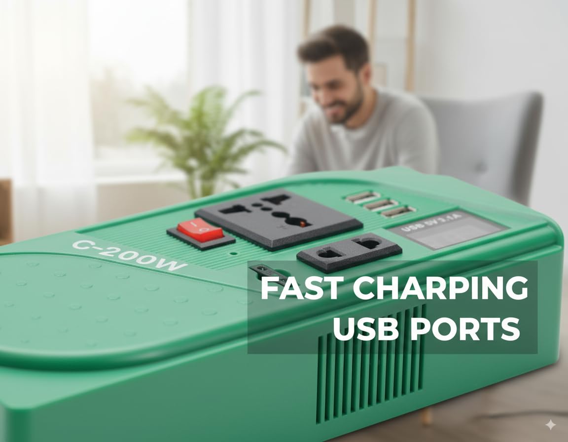 1. 200W High-Power Modified Sine Wave Inverter – Converts 12V DC battery power to 110V/220V AC with continuous output and peak power of 400W. Equipped with 1 AC socket and 3 USB ports for powering multiple devices efficiently with energy-saving technology and high conversion efficiency (>90%).
