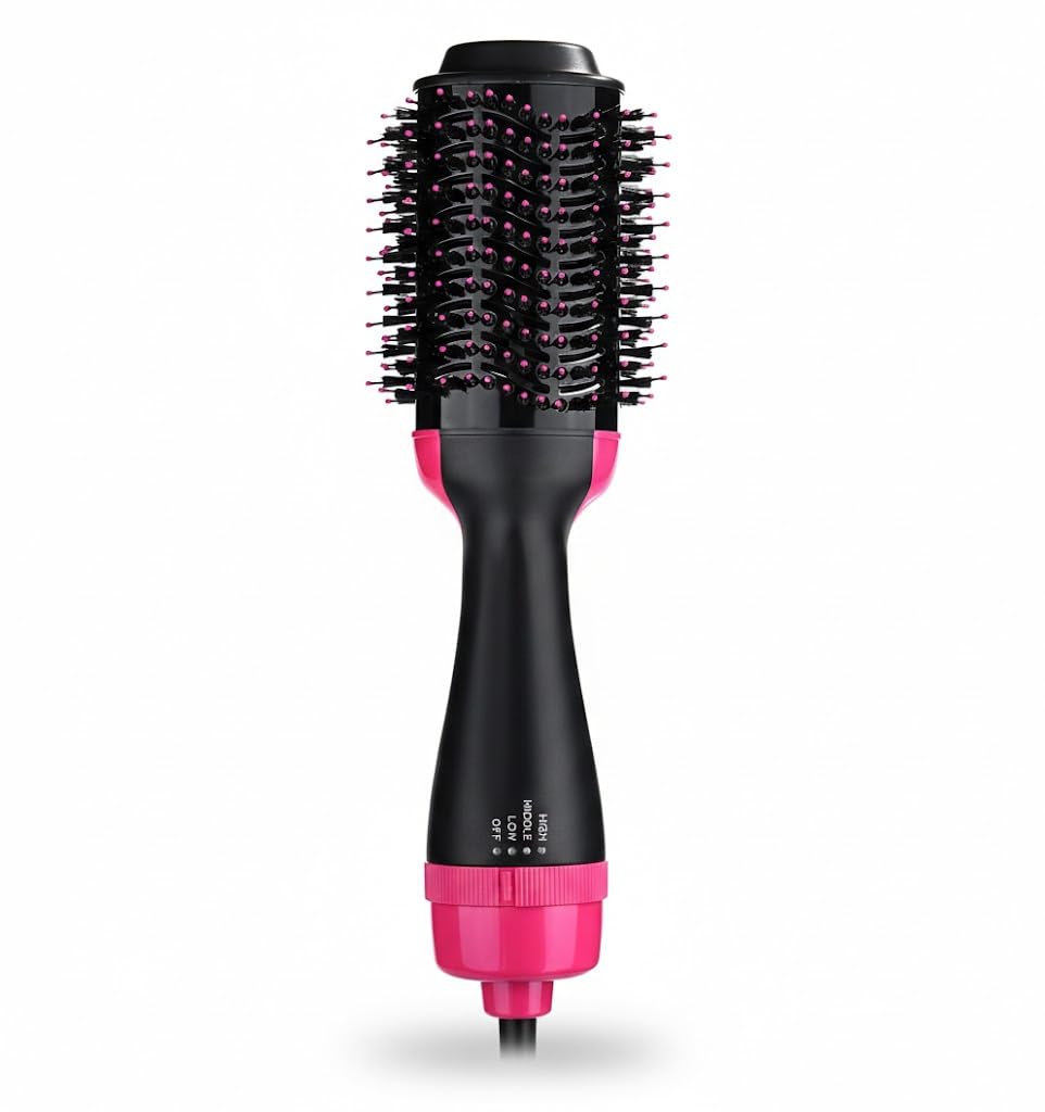 4-in-1 Hot Air Brush Hair Dryer & Volumizer with Ionic Technology – Professional Blow Dryer & Straightener for Smooth & Shiny Styling – Black & Pink