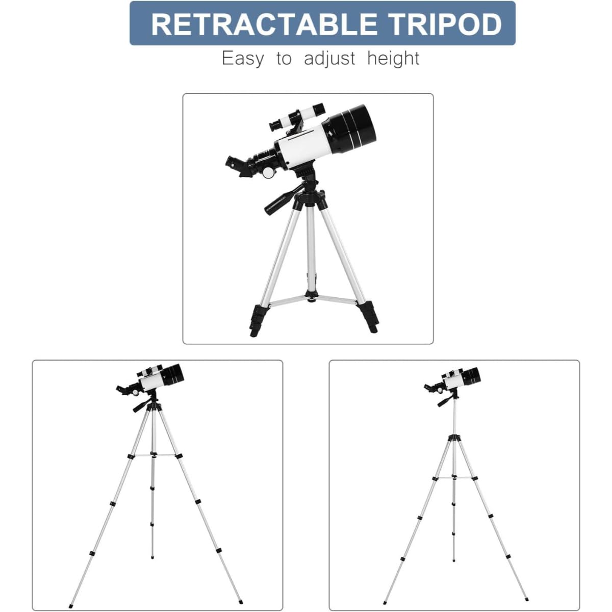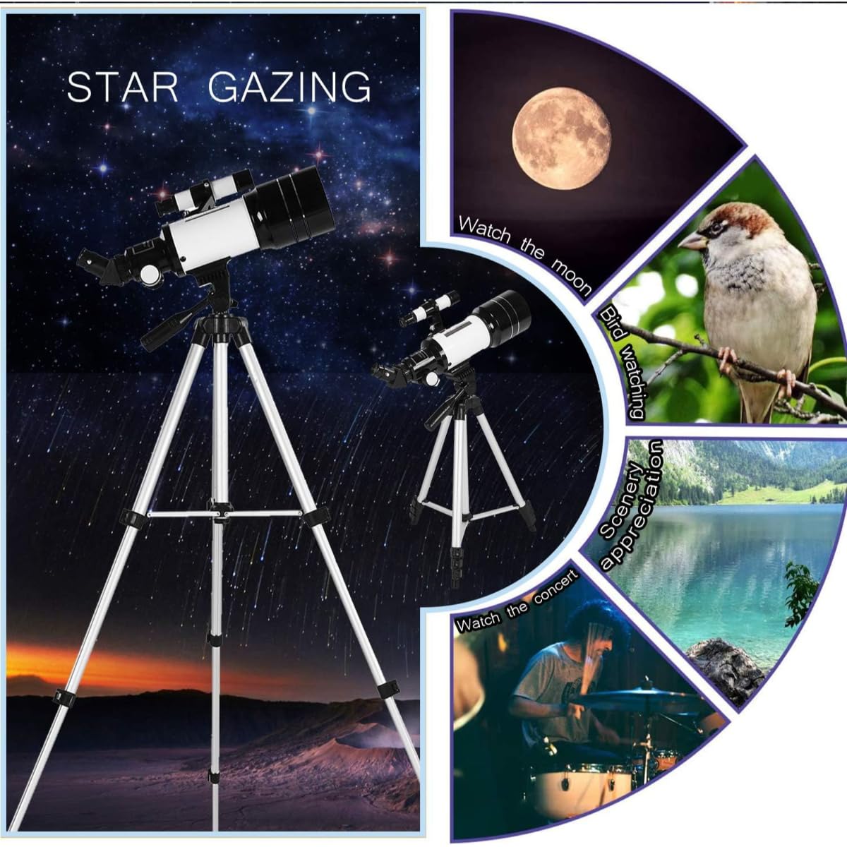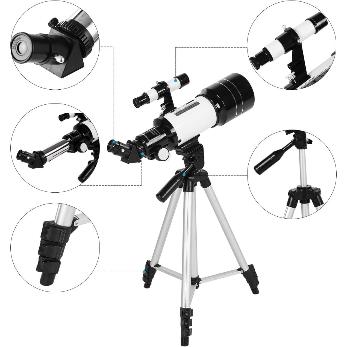 High Power 70mm Refractor Telescope: Experience stunning views of the night sky with this powerful 70mm astronomical telescope. With 150x magnification, coated all-glass optics for enhanced image brightness and clarity, it’s perfect for star gazing, moon viewing, and exploring celestial wonders.