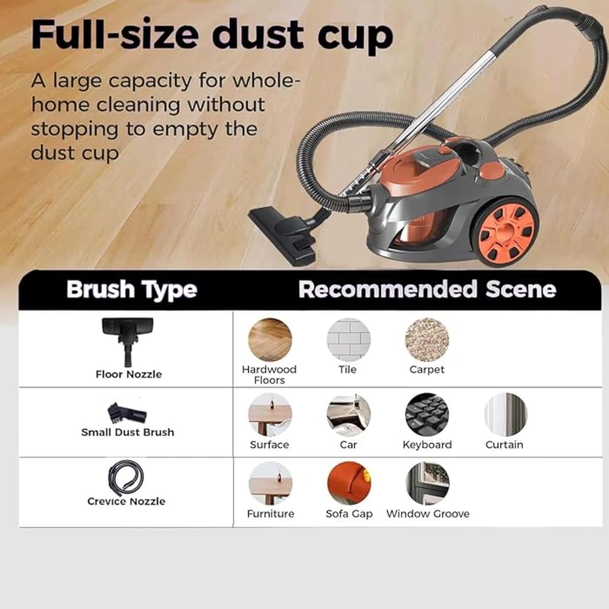 5M Cord & 0.8L Capacity: Enjoy extended reach with a 5-meter cord and large 0.8-liter dust capacity, reducing the need for frequent emptying and allowing you to clean large areas without interruptions.