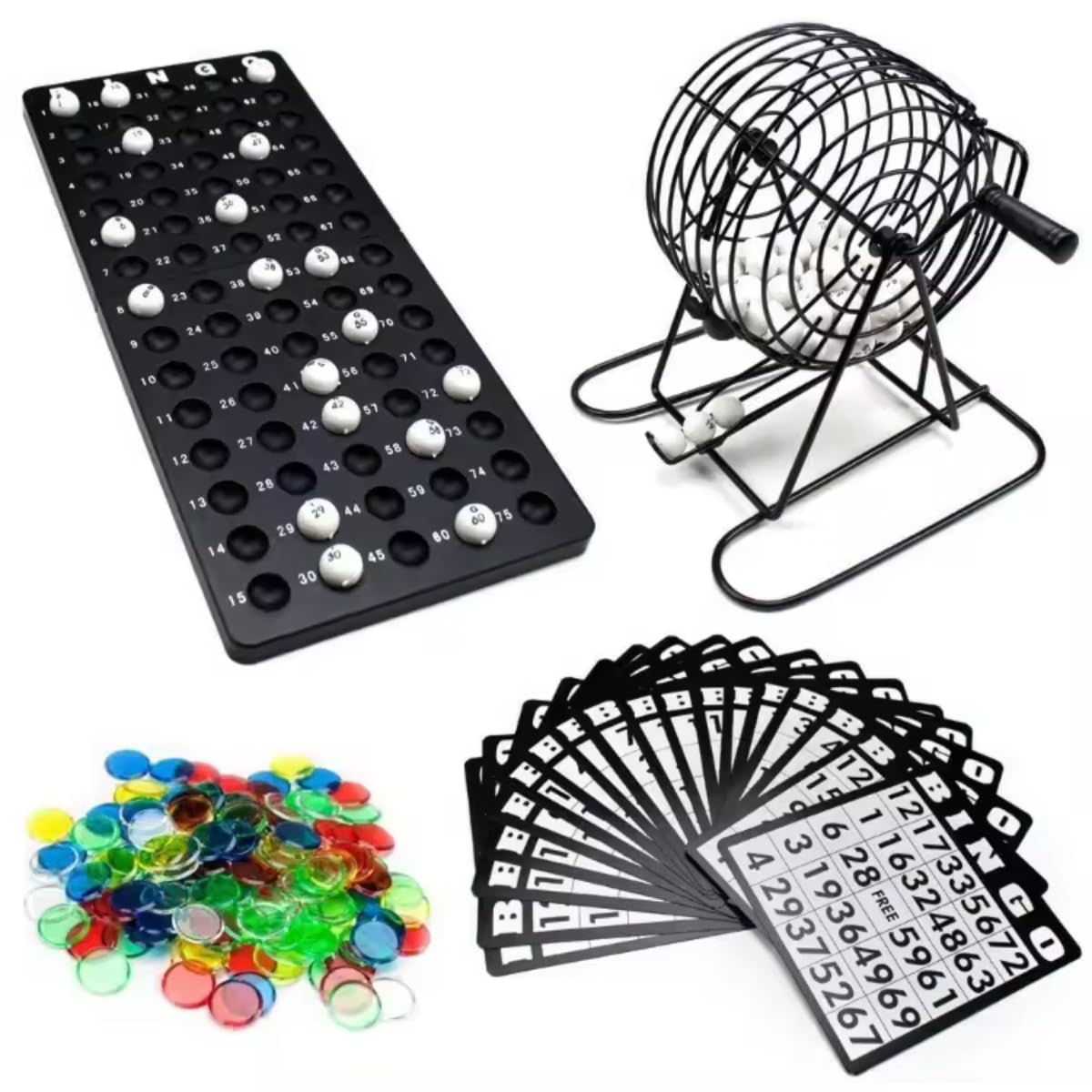Complete Family Bingo Game Set: Includes a sturdy metal cage, 75 balls, Bingo cards, and colorful bingo cards chips. Ideal for family game nights, parties, large groups, and fun indoor activities for kids and adults.