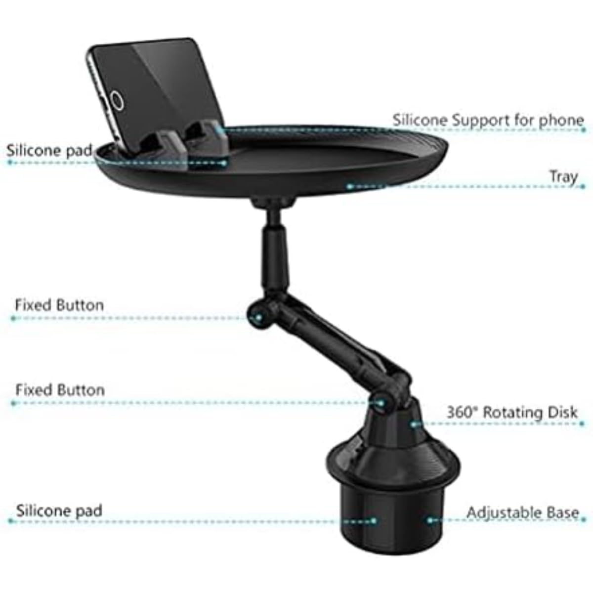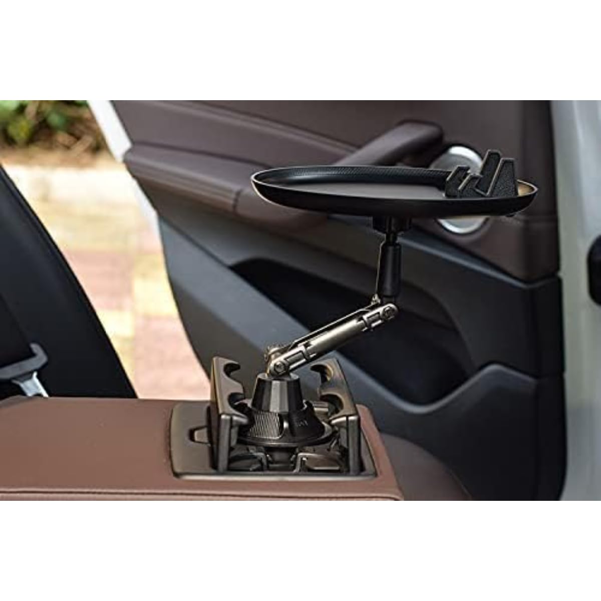 Adjustable 360° Car Tray: Designed for convenience, this car food tray with a secure cup holder, phone slot, and flexible arm adjusts for the perfect dining experience while keeping your car organized.