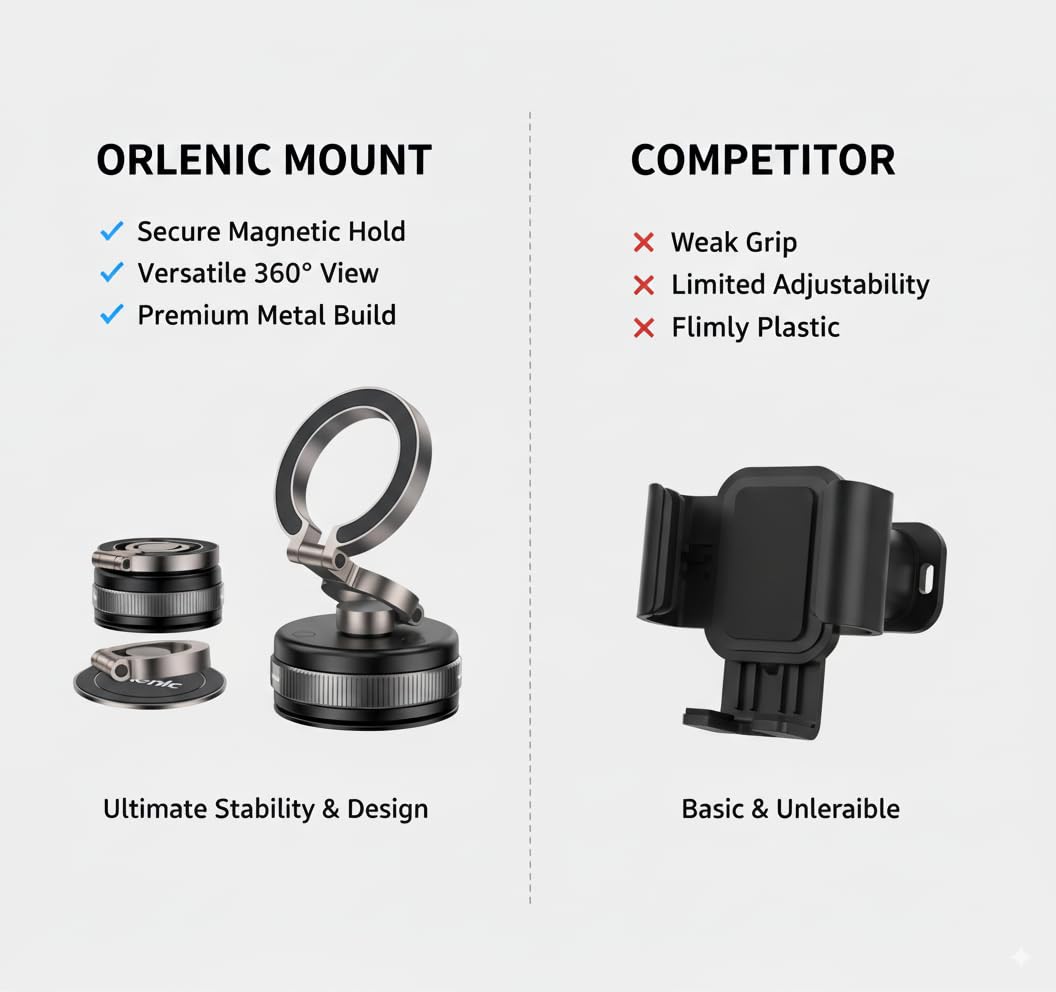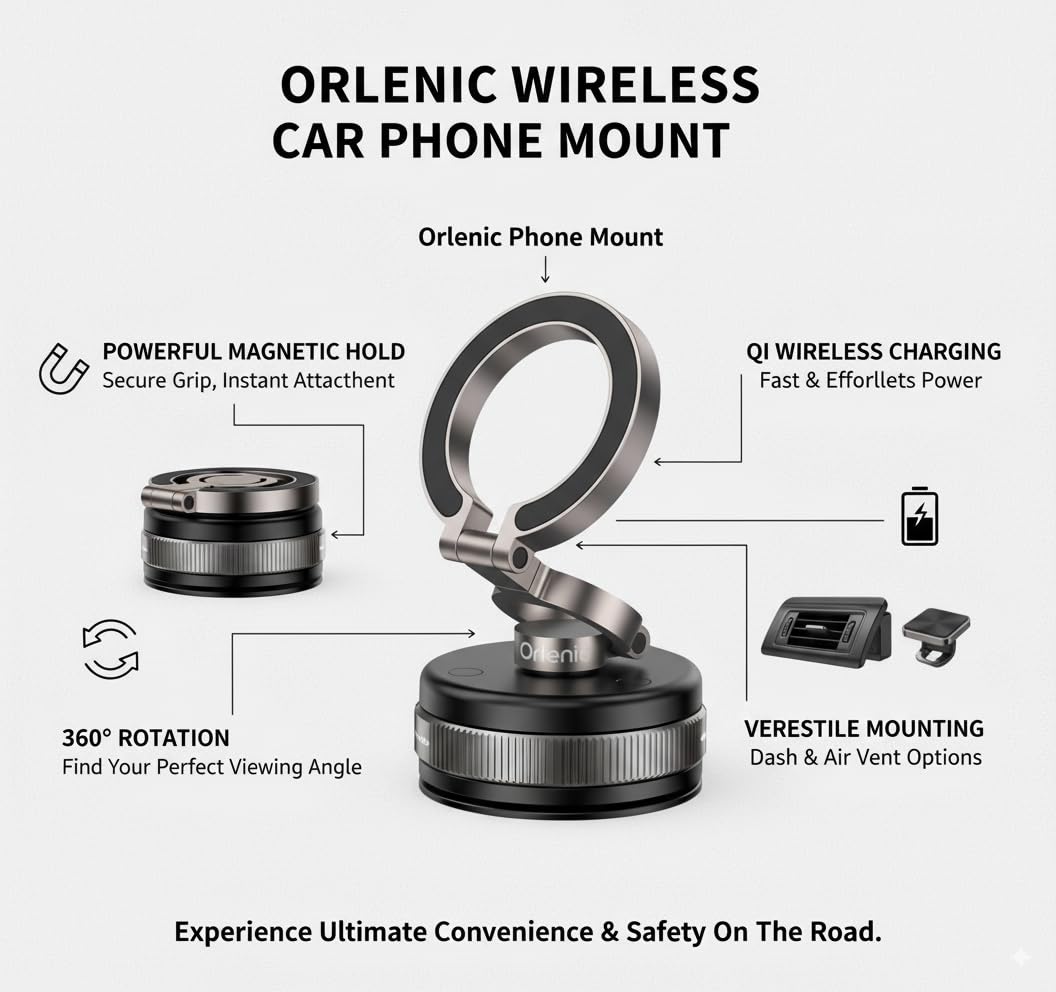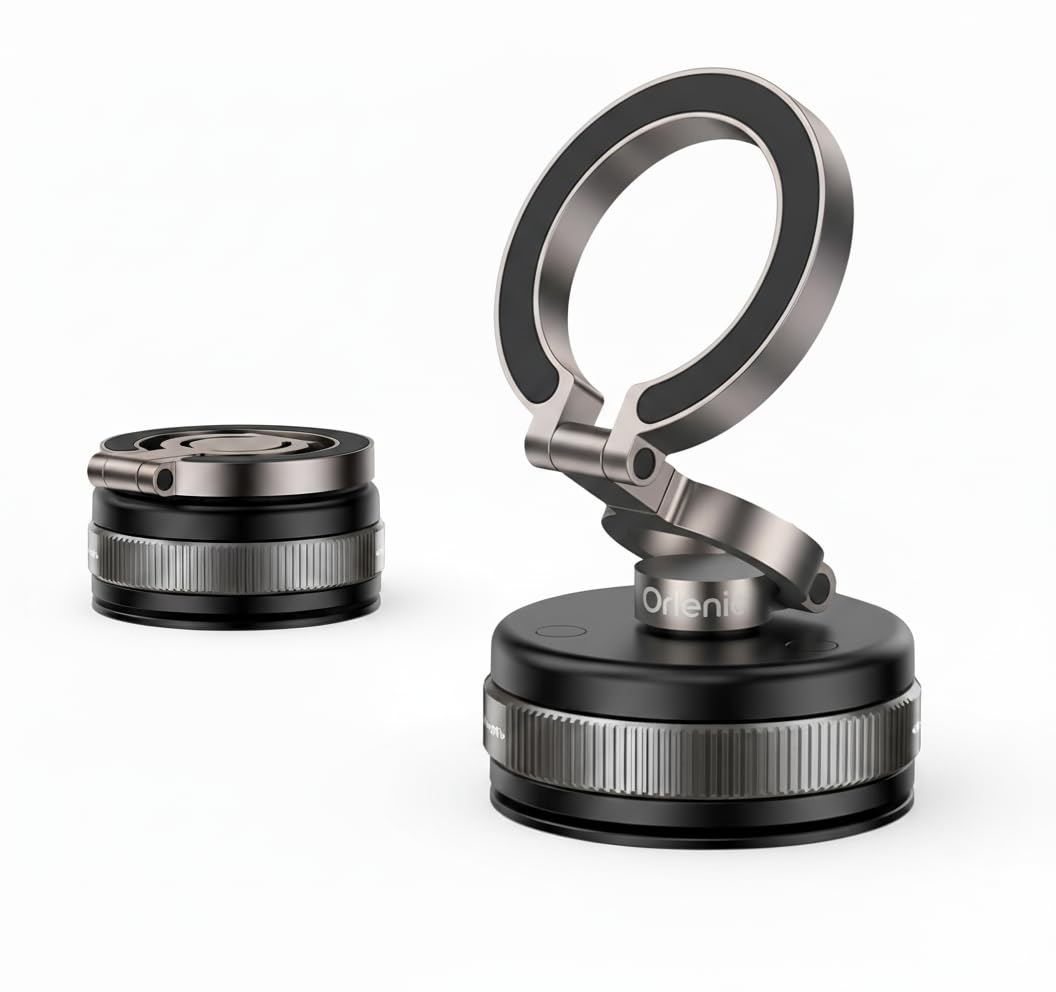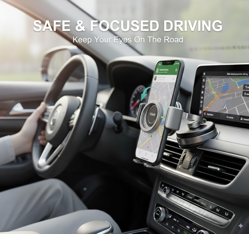 2. STRONG VACUUM SUCTION FOR SECURE HOLD – 360° Adjustable Magnetic Car Phone Holde Advanced Vacuum Suction Technology Ensures Your Device Stays Firmly in Place on Smooth Surfaces. Simply Slide the Built-In Mechanical Button to Activate Suction in Seconds, Providing Stable Support While Freeing Your Hands.
