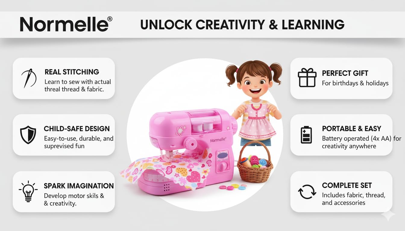 1. Durable Build & Realistic Sewing Play – Crafted from high-quality plastic, this children’s sewing machine is designed for long-lasting use while offering realistic stitching, lights, and sounds to enhance role-play fun and creativity.
