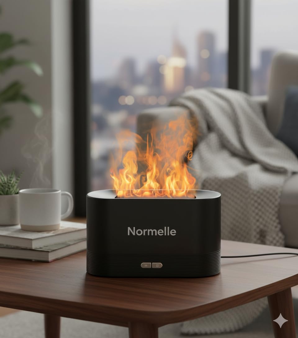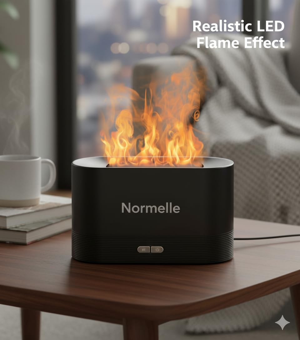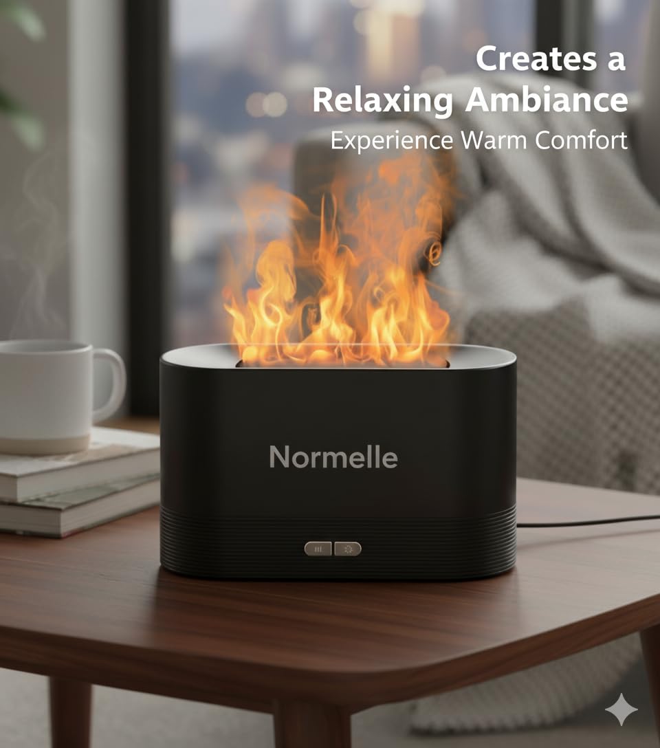 2-in-1 Diffuser and Humidifier with Flame Effect – Combines ultrasonic misting with a realistic flame light to create a warm, cozy atmosphere while improving indoor air quality. Perfect for adding essential oils to enhance relaxation and wellness.