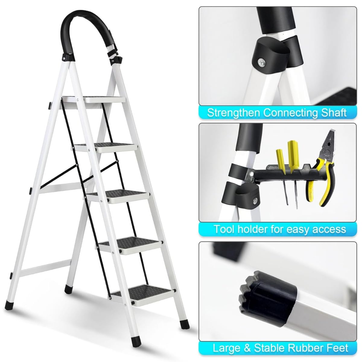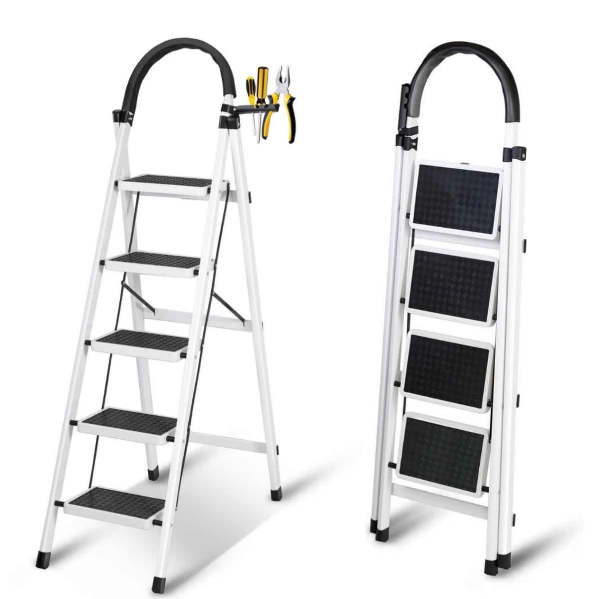 Foldable Ladder 5 Steps/Folding Step Stool with Wide Anti-Slip Pedals, Sturdy Steel Construction for Adults, Home, Kitchen, Garden, or Office Use