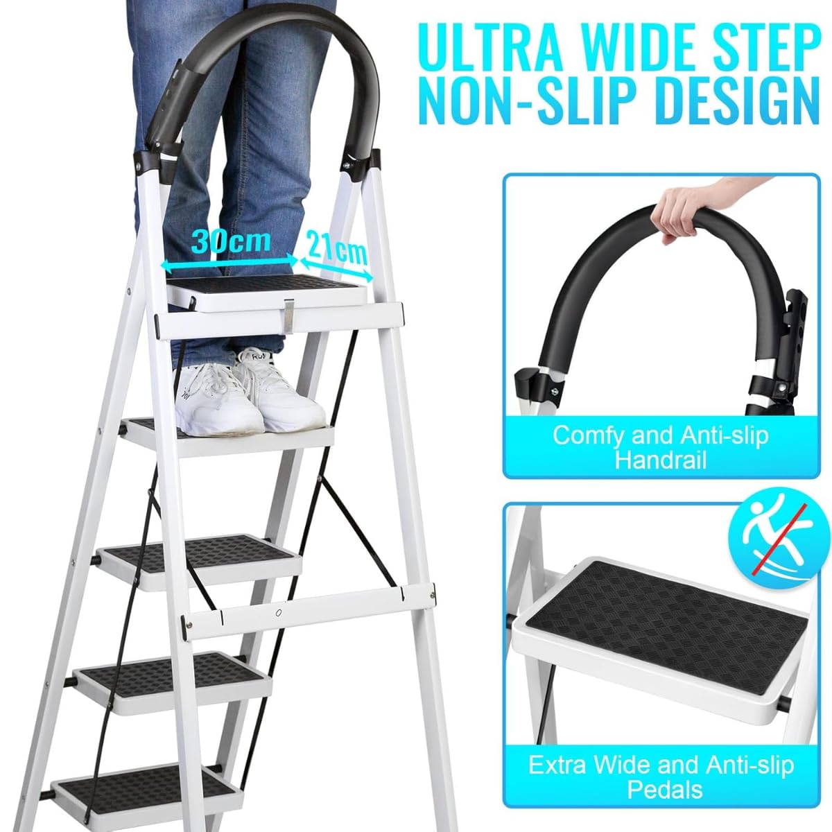 Features 5 extra-wide steps with textured anti-slip surfaces to provide secure footing and enhanced grip, reducing the risk of slips and falls.