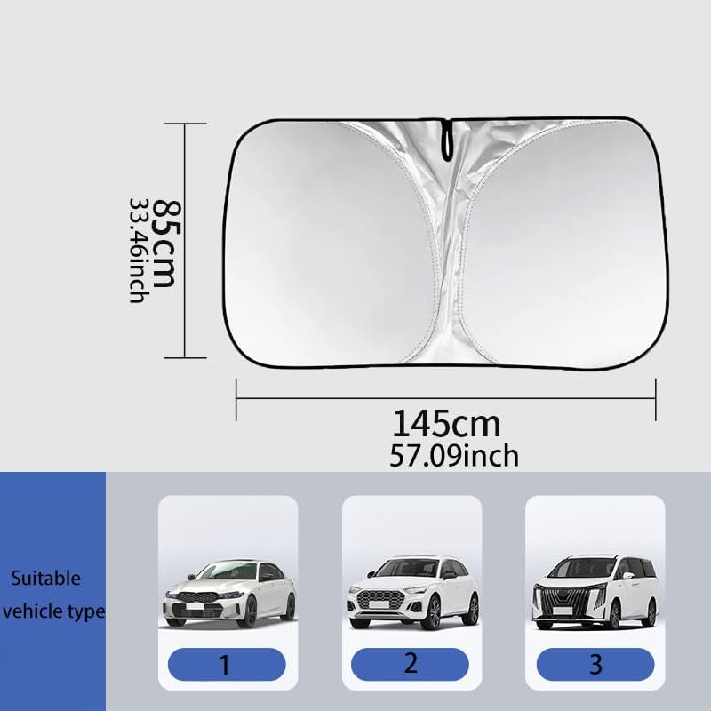 ⭐【 Regarding the size of the windshield 】 Our windshield sunshade is 57 x33 inches (145 x 85 centimeters). It is suitable for most family cars. It can not only effectively block the heat and ultraviolet rays of the sun, but also bring you coolness while protecting your and your family’s eyes and skin