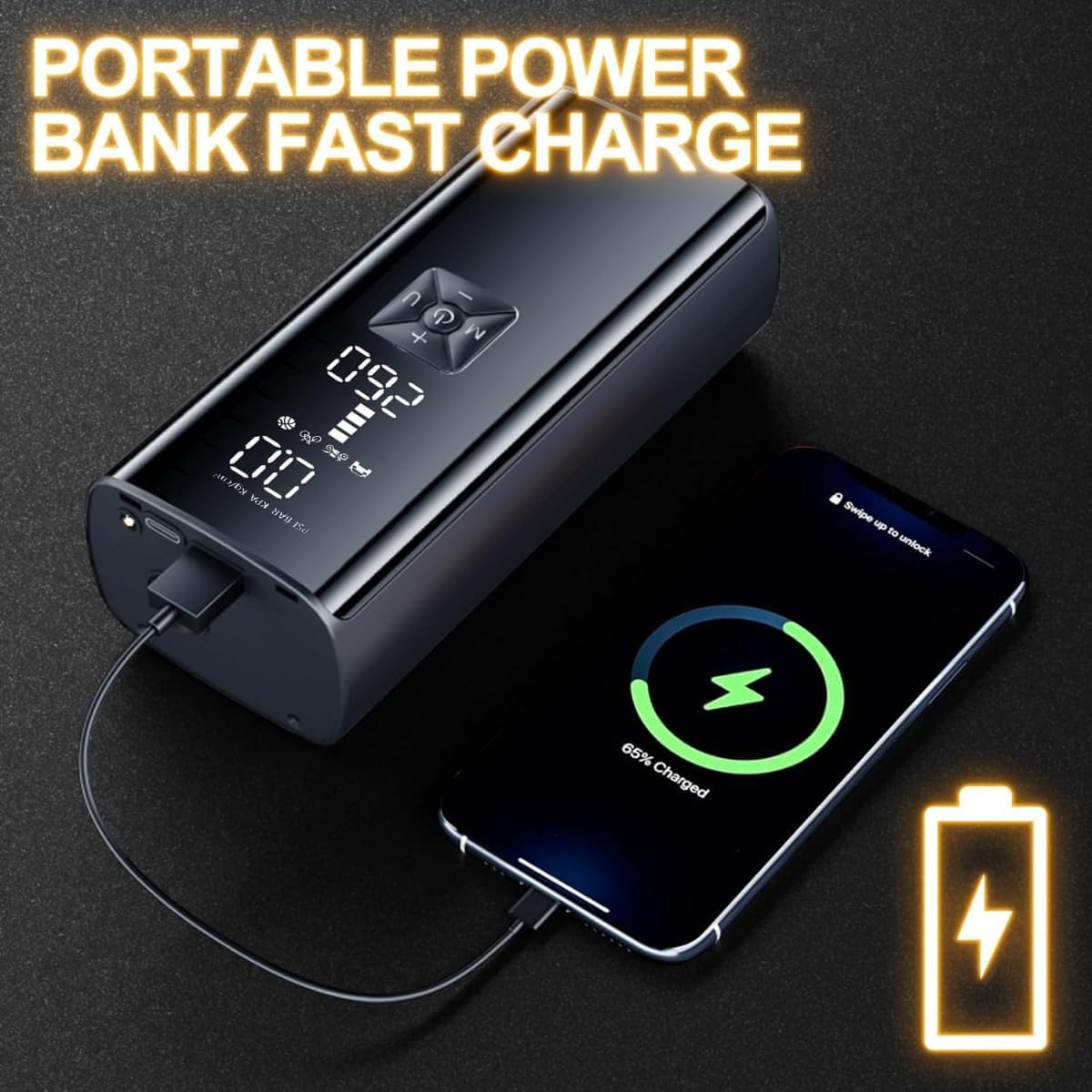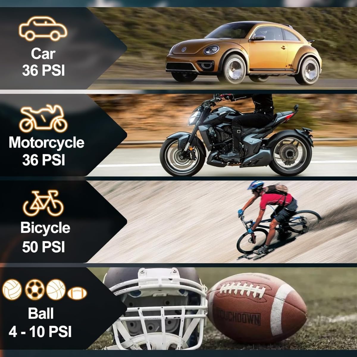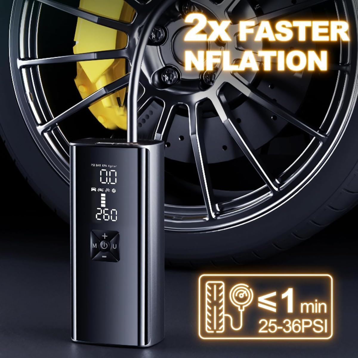 Powerful and Efficient: Inflates car tires, bikes, and sports equipment quickly and effortlessly with a maximum pressure of 150PSI.