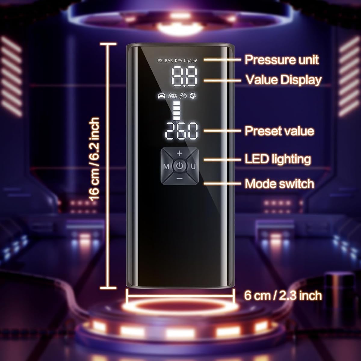 Built-In LED Light: Provides illumination for nighttime emergencies or roadside repairs, ensuring visibility and safety during inflation.