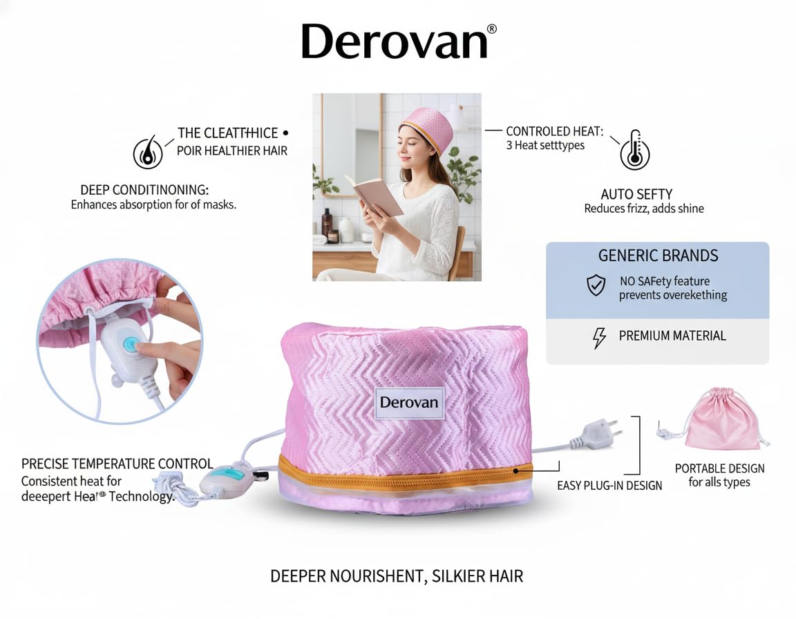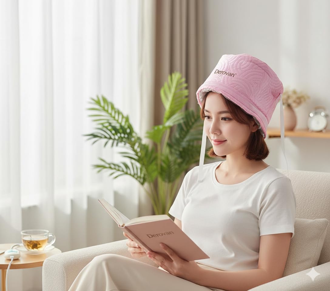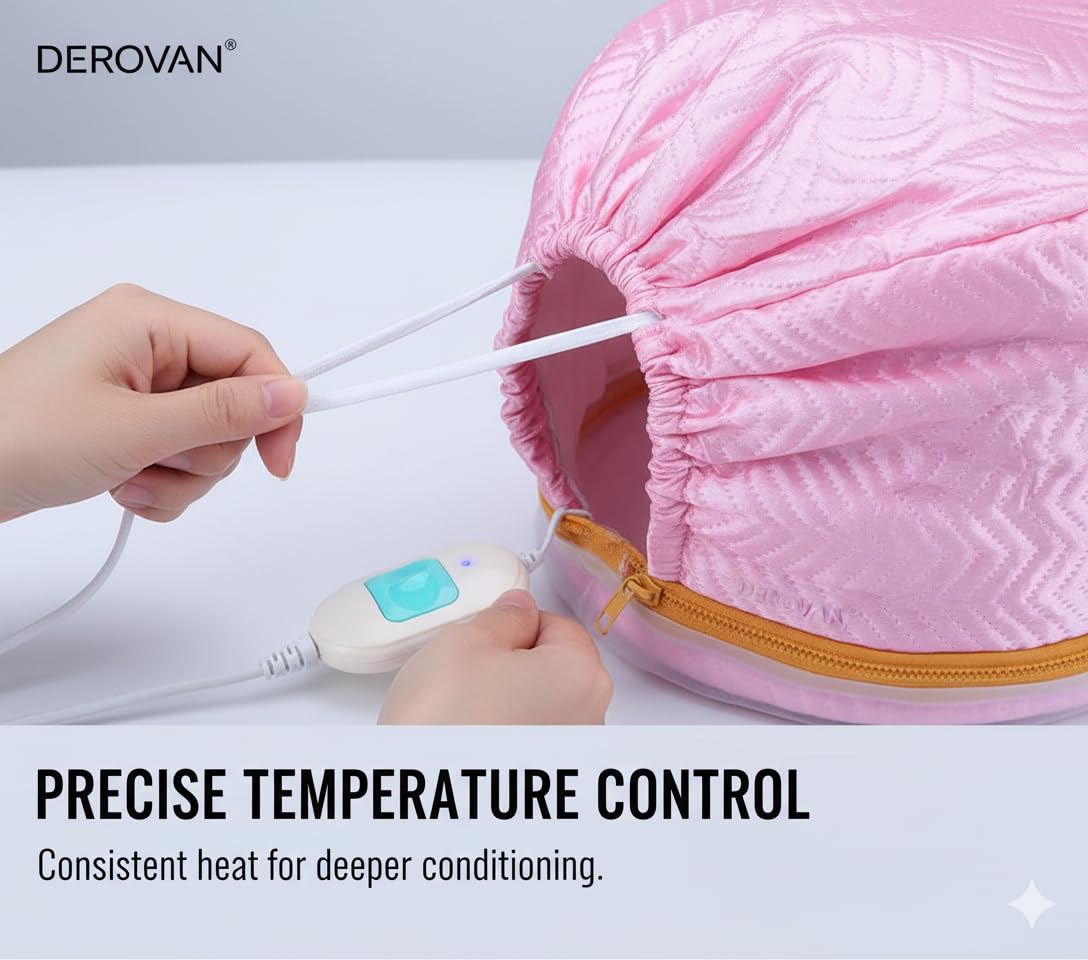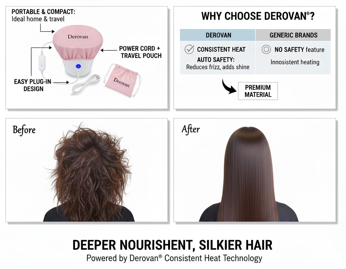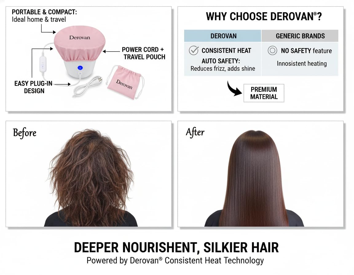 Gentle, Salon-Quality Heat Therapy – The Derovan cap emits uniform, adjustable warmth (low and high settings), which opens hair cuticles for deeper absorption of conditioners, oils, and masks, resulting in noticeably softer, more nourished strands (industry insight: heat caps aid product penetration and moisture retention)