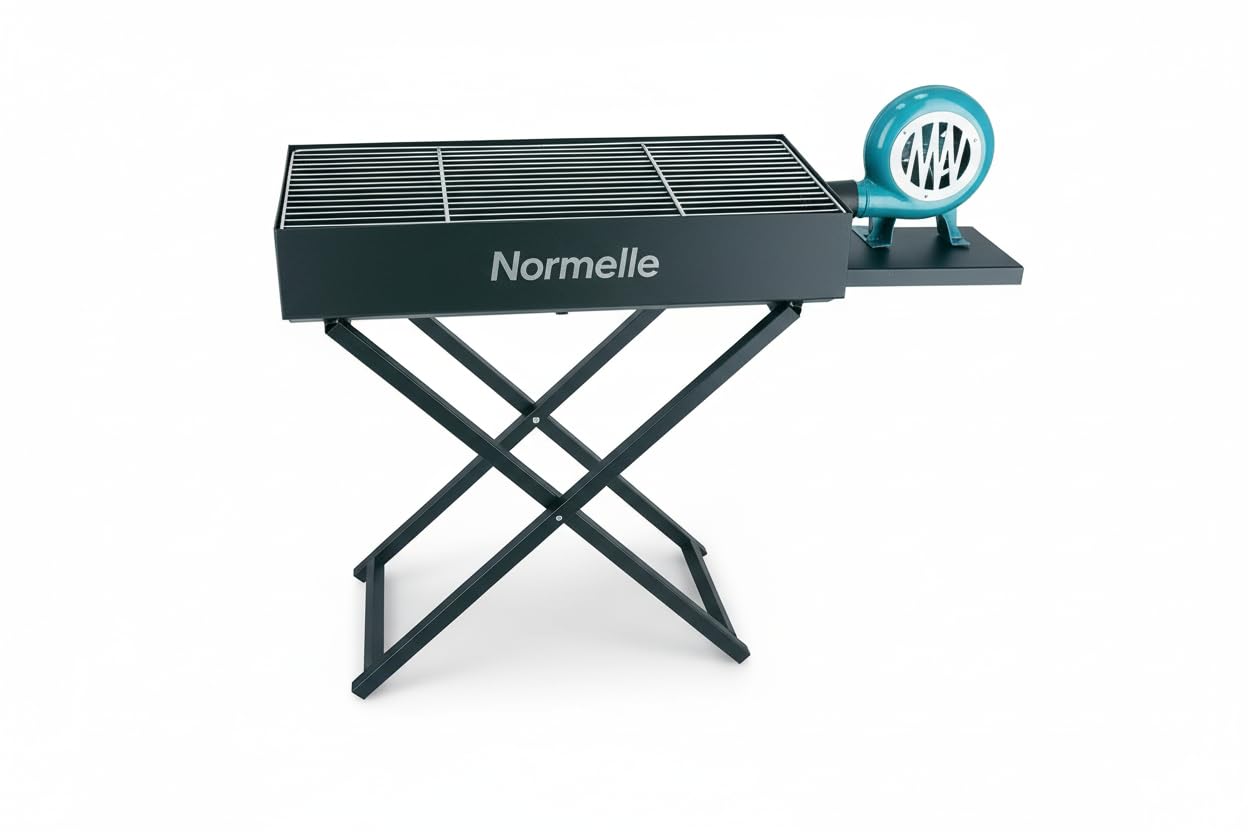 Heavy Duty Foldable Barbecue Charcoal Grill with Blower Fan – Large Iron Outdoor BBQ Grill with X-Shape Stand, Adjustable Height, Portable Cooking Rack for Camping, Garden, Picnic