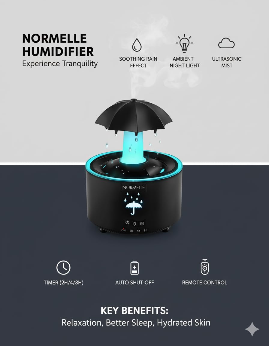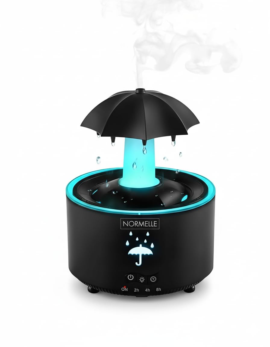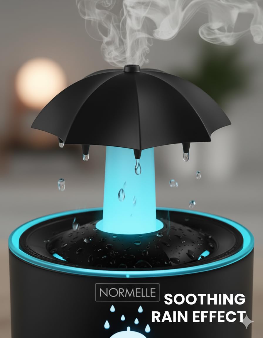 Experience a unique rain-inspired ambiance with this umbrella-shaped humidifier. The rotating top and natural raindrop sound (<36dB) offer calming comfort, perfect for relaxation or sleep.