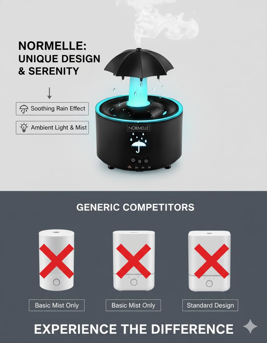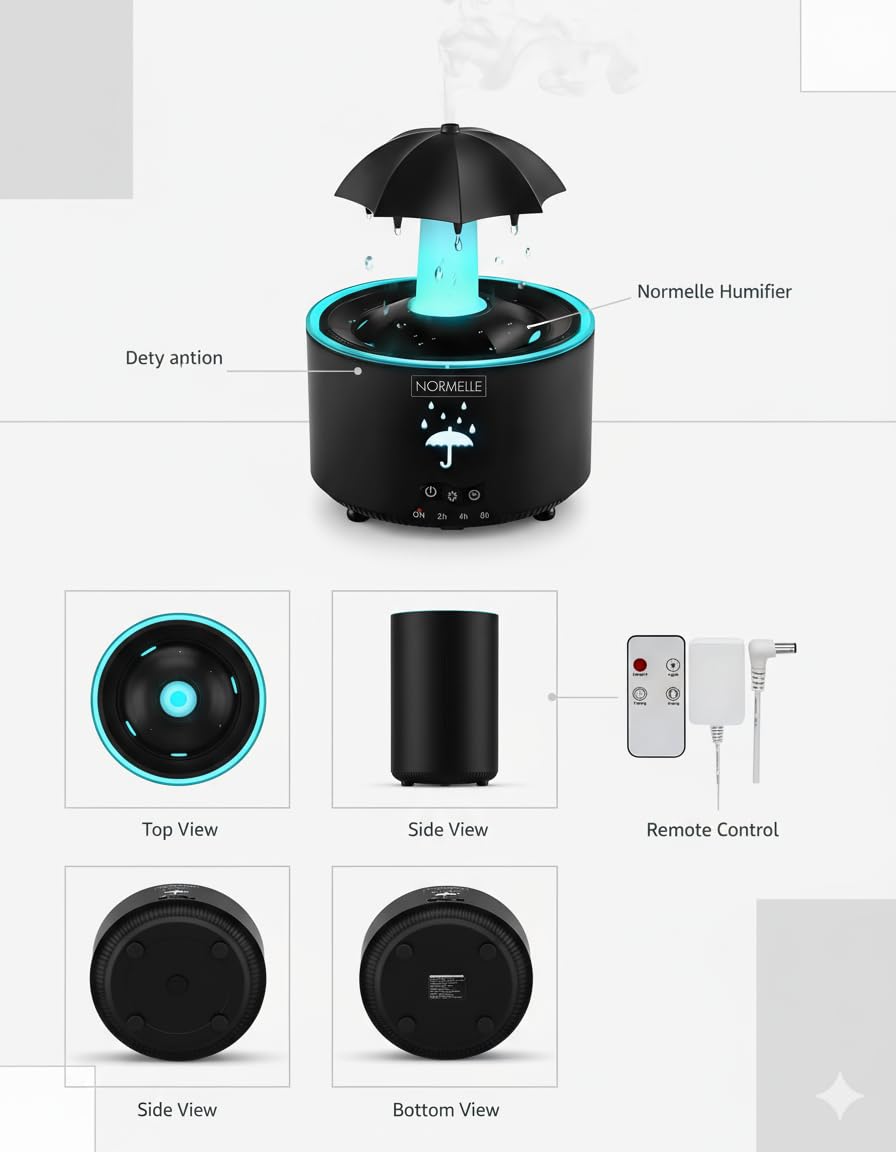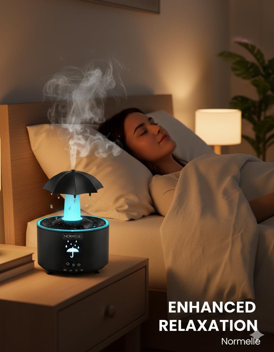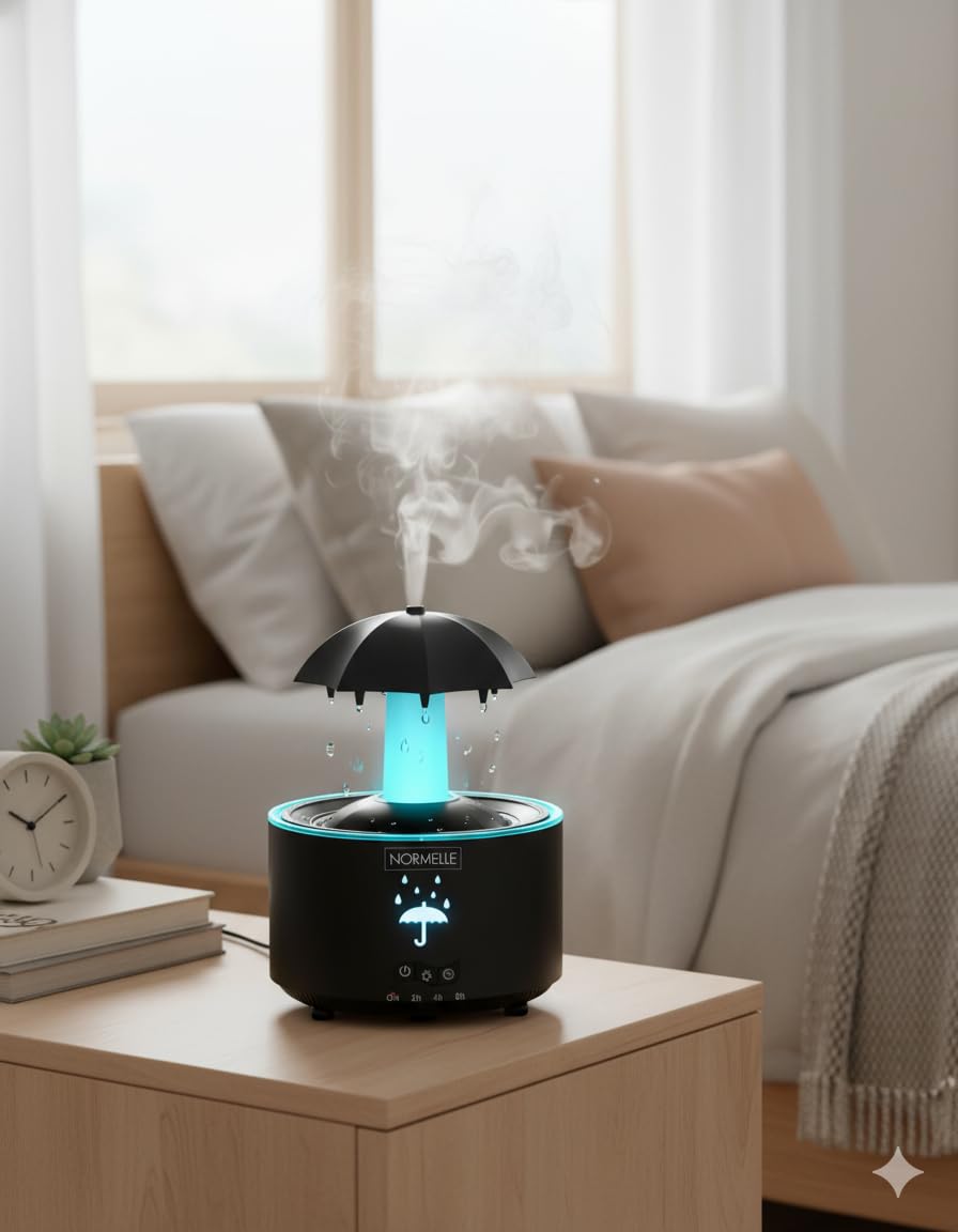 Experience a unique rain-inspired ambiance with this umbrella-shaped humidifier. The rotating top and natural raindrop sound (<36dB) offer calming comfort, perfect for relaxation or sleep.