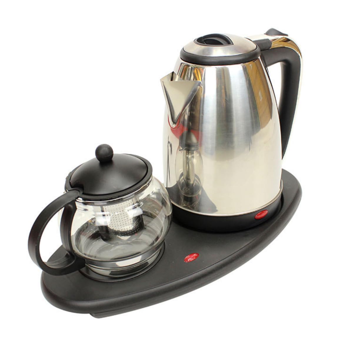High-efficiency electric kettle and tea/coffee maker set with 360° rotating base, offering fast water boiling and a sleek glass teapot. Perfect for serving tea or coffee at home or office gatherings.