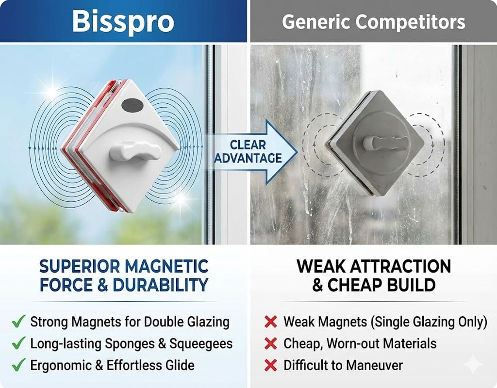 EFFORTLESS DOUBLE-SIDED CLEANING – This magnetic window cleaner revolutionizes glass cleaning by allowing you to clean both interior and exterior window surfaces simultaneously without ladders or scaffolding, making it the perfect magnetic glass cleaner for high-rise apartments, office buildings, and multi-story homes where reaching outside windows safely is challenging.