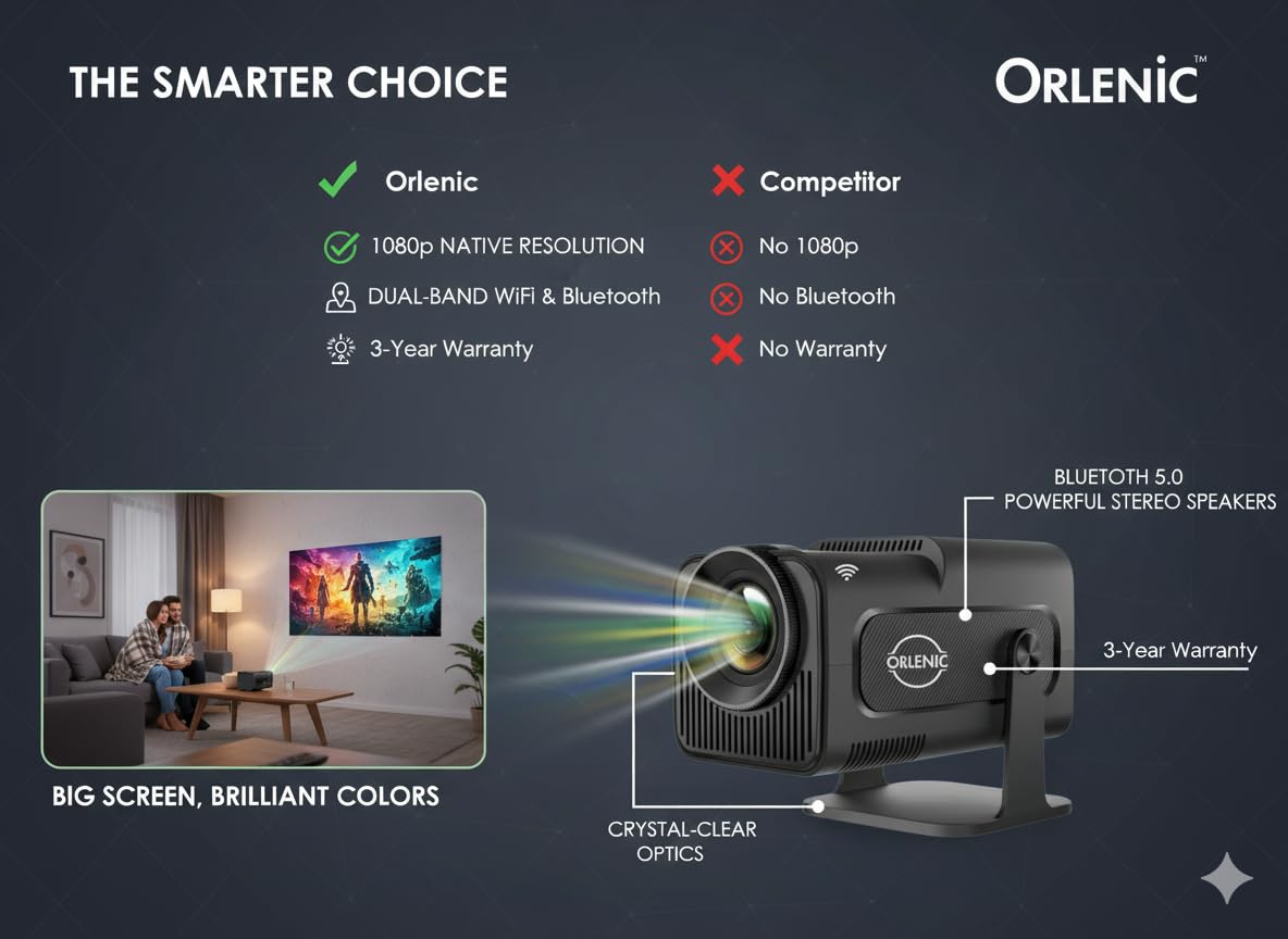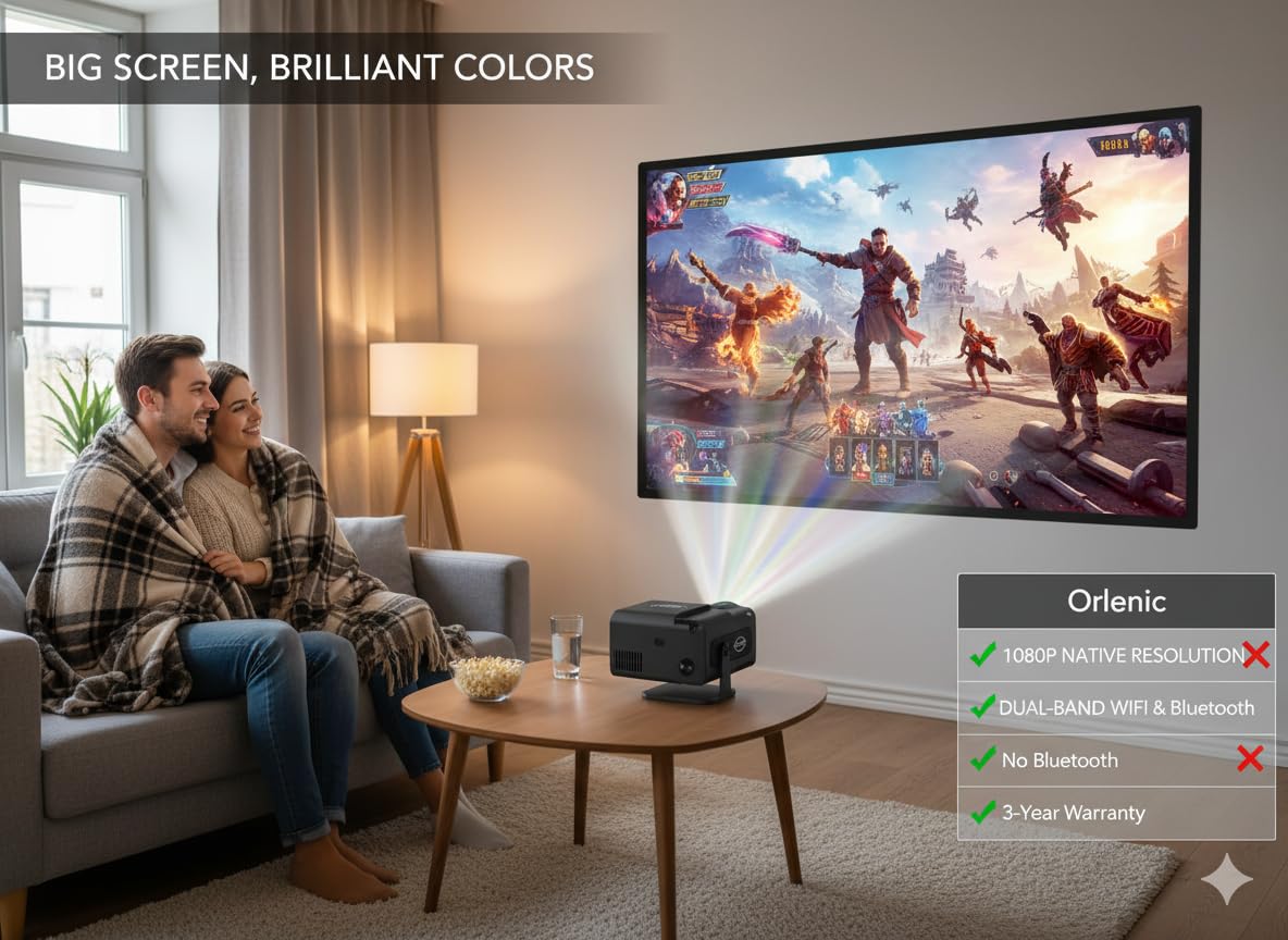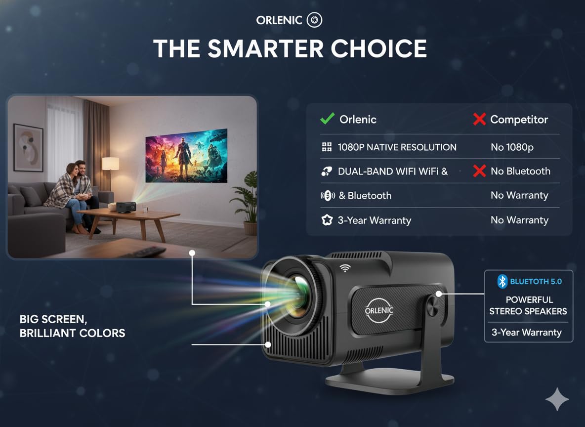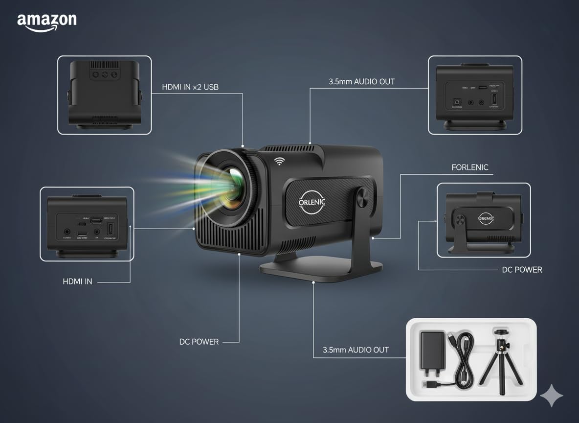 Ideal for home theaters, dorm rooms, or backyard events. Built-in 3W Hi-Fi speaker delivers immersive sound. Enjoy a 30″–150″ screen size. (Note: Bluetooth does not support smartphones or laptop audio transmission.)