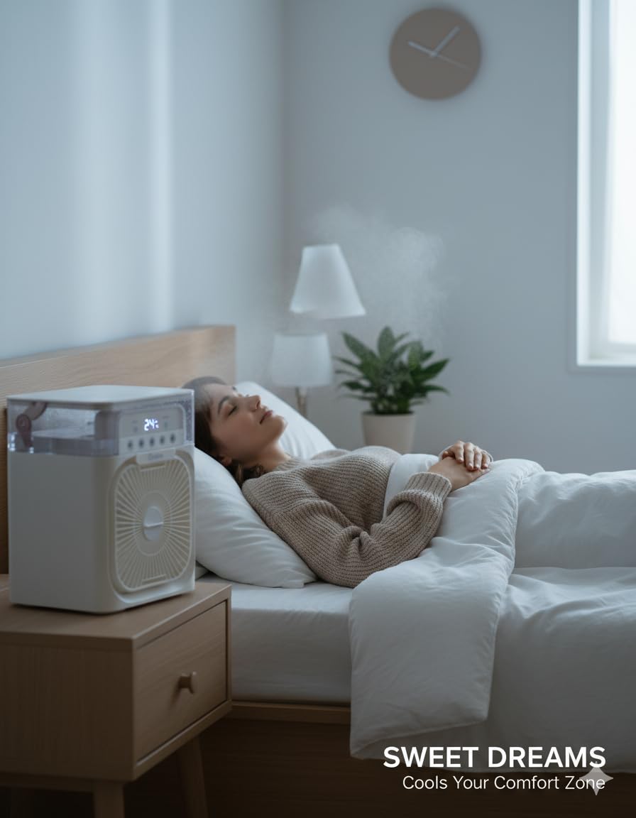 1. Portable Cooling with Humidification – Stay cool and refreshed with a multifunctional air cooler fan that combines cooling and misting in one unit. Helps prevent dryness on hot days by keeping your skin, hands, and nose hydrated while circulating a steady flow of cool air for comfort indoors or outdoors.