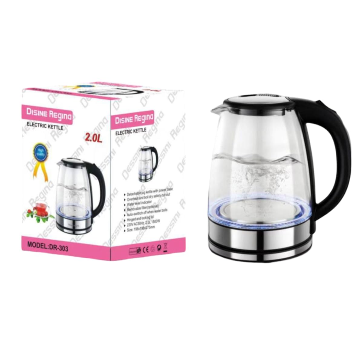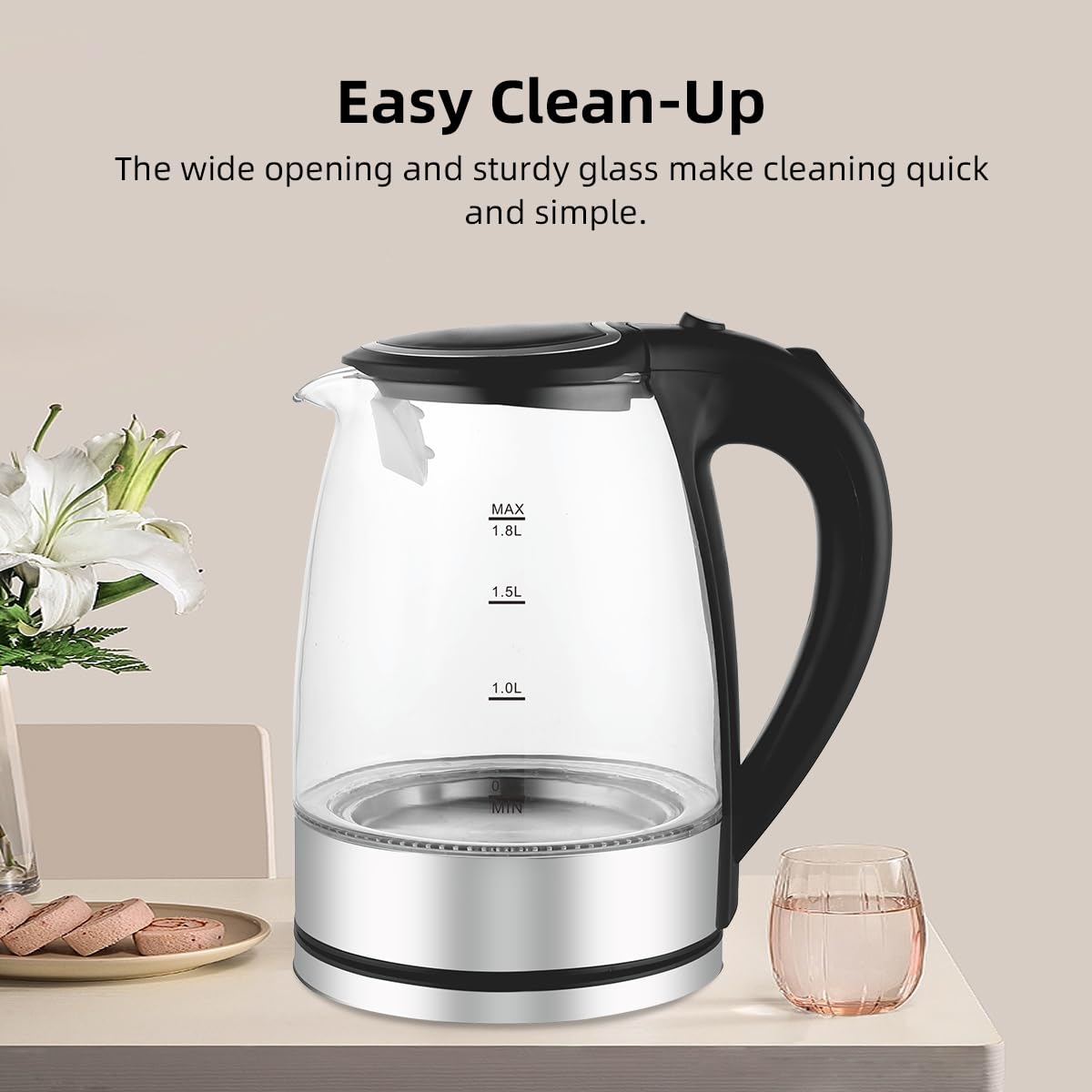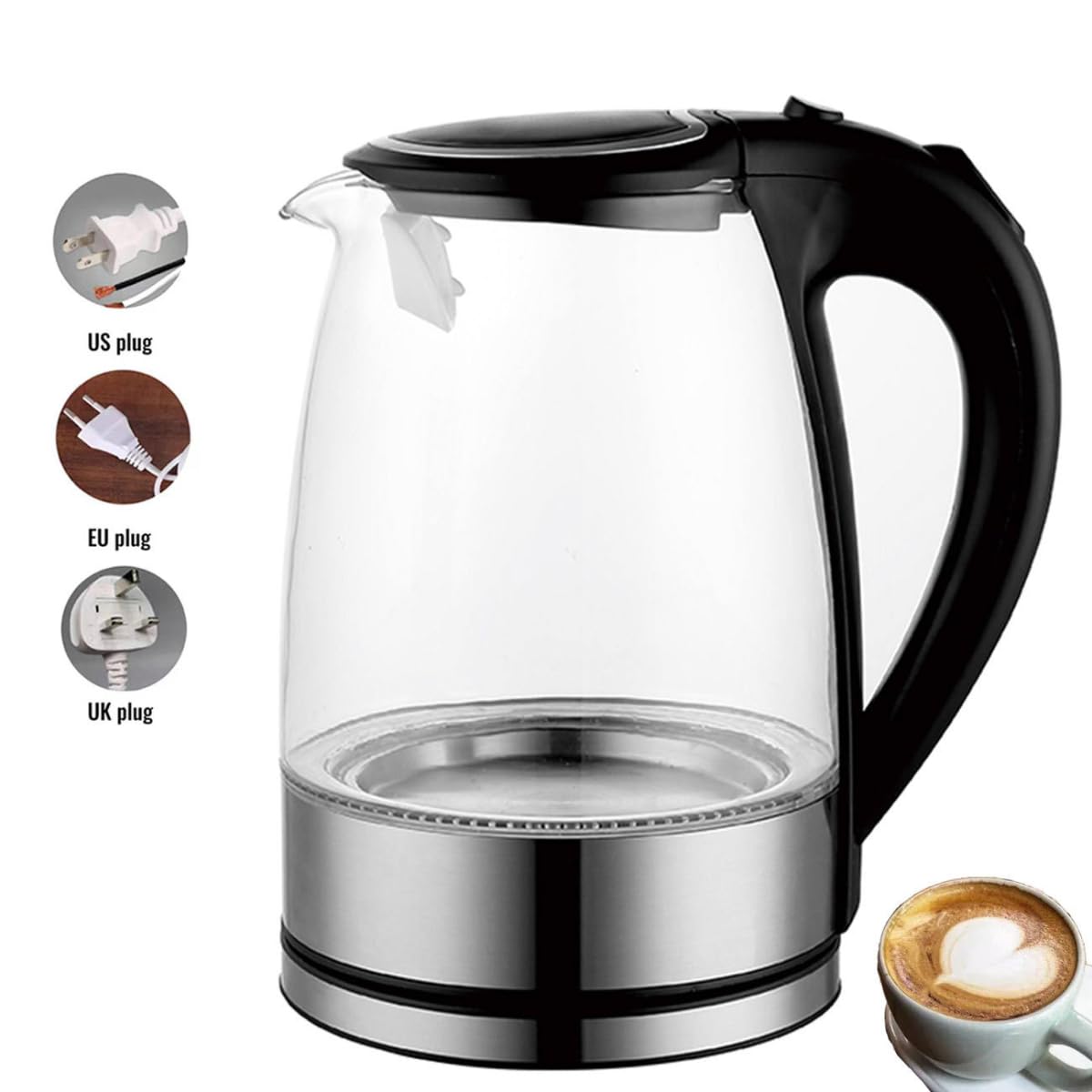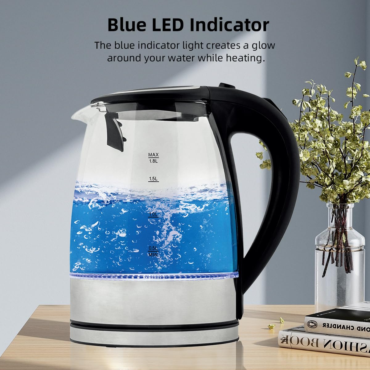 Elegant Design: The sleek glass body combined with stainless steel gives a modern and stylish look, while the customizable blue indicator lights up during boiling for a charming kitchen ambiance.