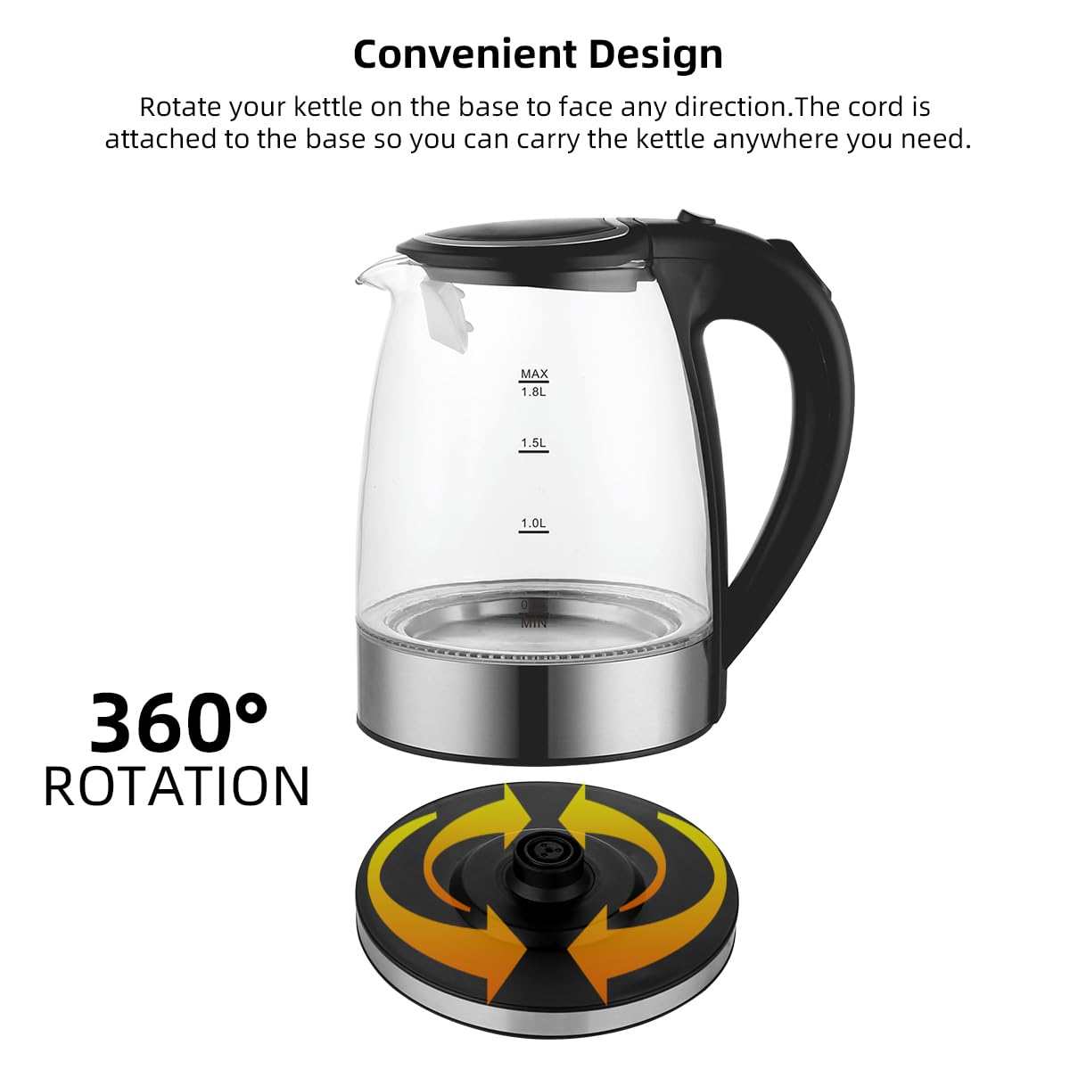 User-Friendly Operation: With a 360° swivel base and integrated power cord storage, this kettle is easy to use for both right and left-handed individuals, and its anti-scalding handle ensures safe pouring.