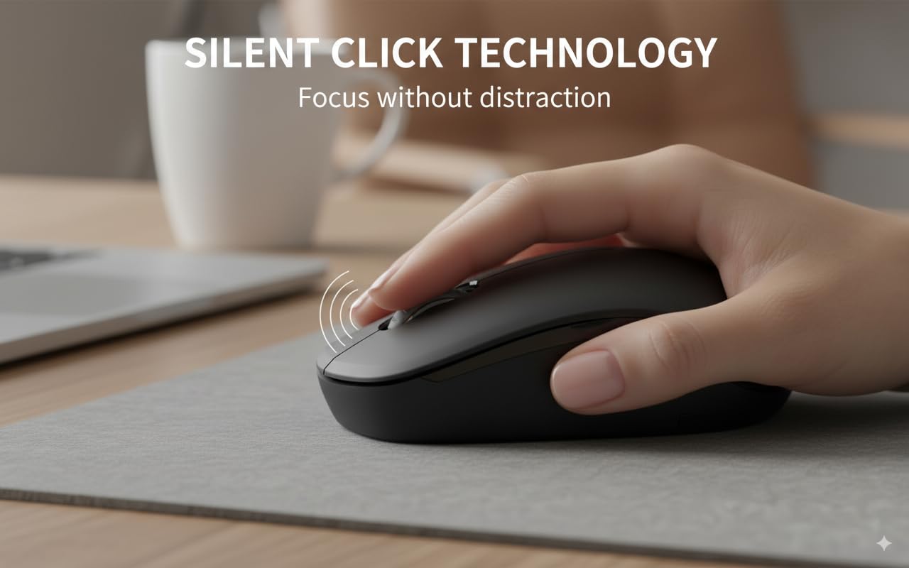 Silent Click Design for Quiet Environments – The noiseless button clicks reduce distraction by up to 90%, making this mouse suitable for offices, libraries, classrooms, and late-night use without disturbing others around you.