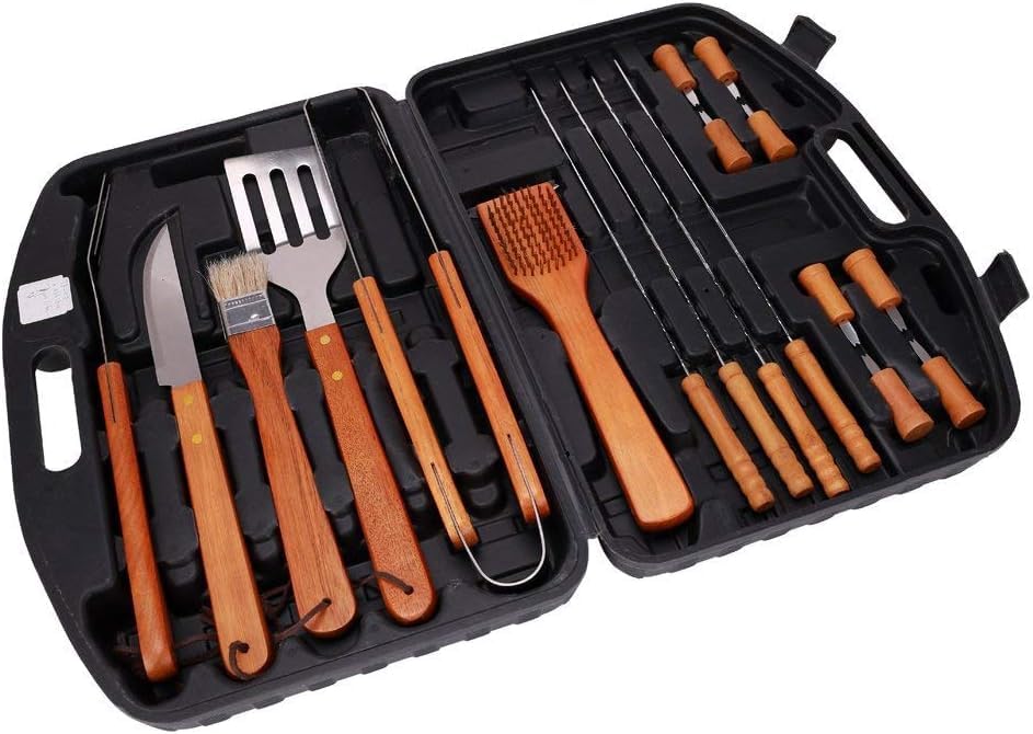 This 19-piece wooden-handled barbecue tool set includes all the essential accessories for outdoor grilling and cooking.